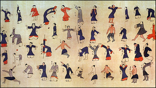 4) Los juegos de los cinco animales (wuqinxi), elaborados por Hua Tuo (a.n.e ?- 208), nombre del cirujano del período de los tres reinos posteriores a los Han del Este (220-280). Se dice que por su persistencia en practicarlos, se veía como un jóven a la edad de 90 años. 3