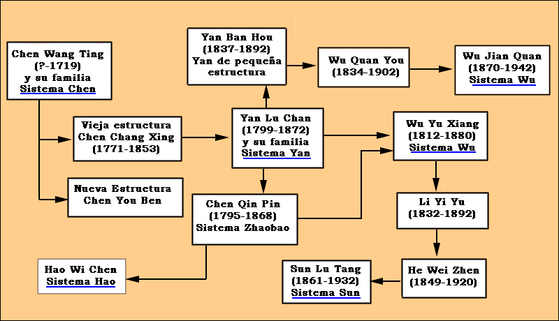 A finales del siglo XVIII uno de los grandes maestros de las artes marciales Wang Zong Yue escribió un texto donde la forma de combate fue nombrada "taijiquan". En 1852 Yan Luchan (1798-1872), la introdujo en Beijing, popularizándose.4