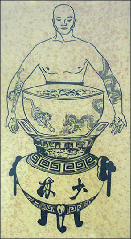 "Estos maniquíes estaban equipados con armas que incluían puños de madera, bastones, cuchillos, lanzas, etc. El genio mecánico que construyó los muñecos, los dispuso en tal forma que ni siquiera él sabía cómo actuarían al hacerlos funcionar. El estudiante que caminaba por este corredor no tenía conocimiento que las duelas sobre las cuales caminaba era el sistema de poner en acción los maniquíes. El peso del estudiante determinaba el número de duelas que hacía funcionar. Así era muy posible que lo atacaran tres o más muñecos al mismo tiempo. Si el estudiante sobrevivía con éxito a este viaje, la prueba última y final, era mover una urna de 225 kilogramos que estaba al rojo vivo, para poder salir por la última entrada. La forma en que tenía que mover esta urna, era empleando los antebrazos para abrazarla, marcando así en ellos, dos símbolos: un dragón y un tigre. Entonces, éste era el diploma de un graduado de Shaol-lin en China meridional. A donde quiera que fuese, éstos símbolos le proporcionaban respeto y honor". 1